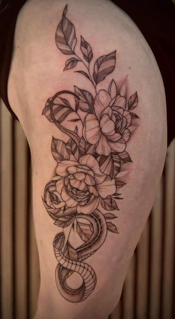 Known for her soft, intricate style and dreamy attention to detail, she specializes in delicate black and grey, fine line florals, and elegant illustrative pieces that give life to skin. Every tattoo is approached with a whole lot of heart because your story deserves nothing less.